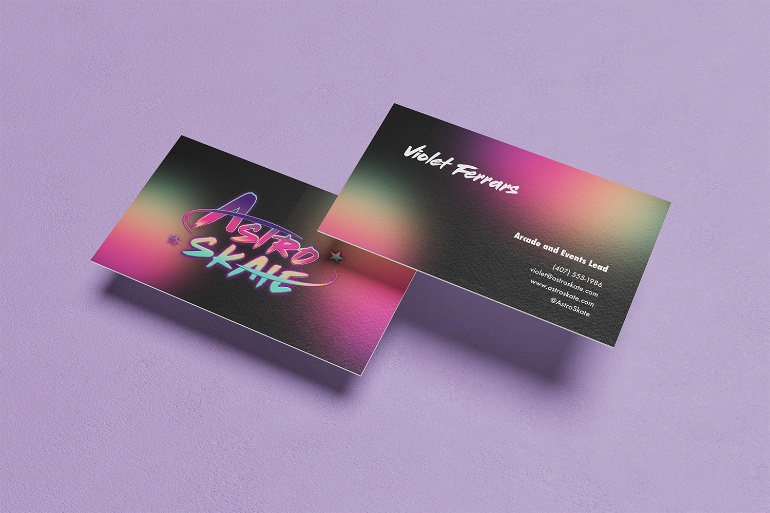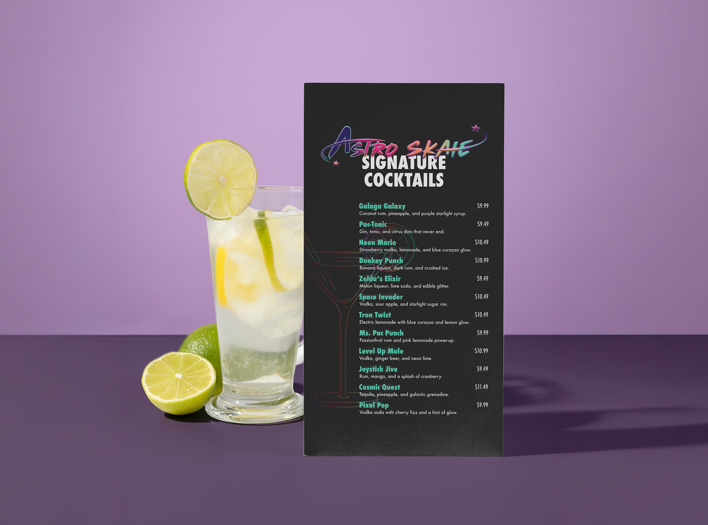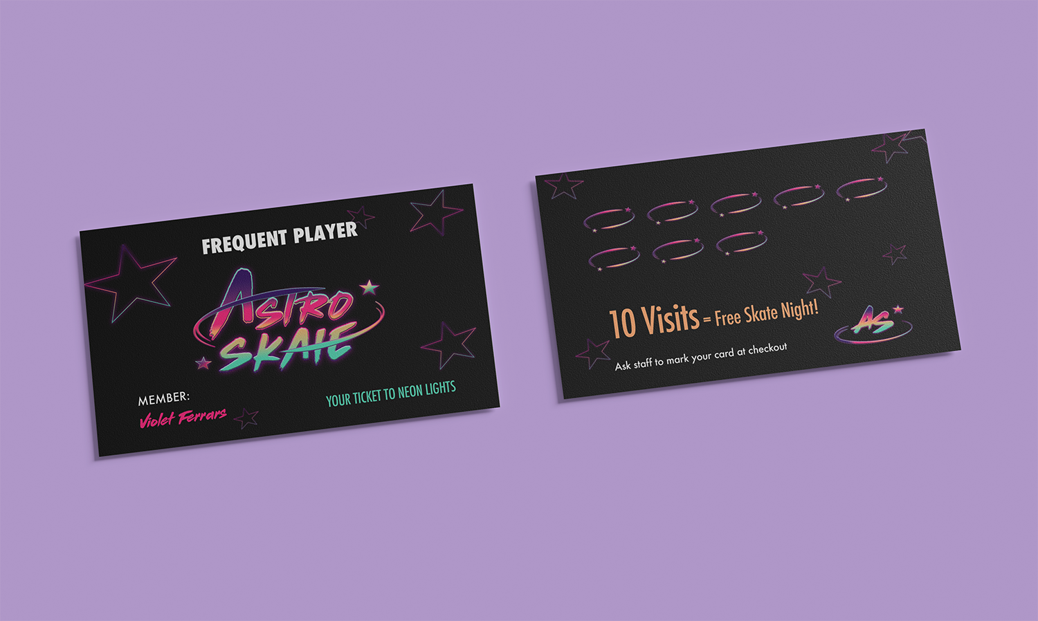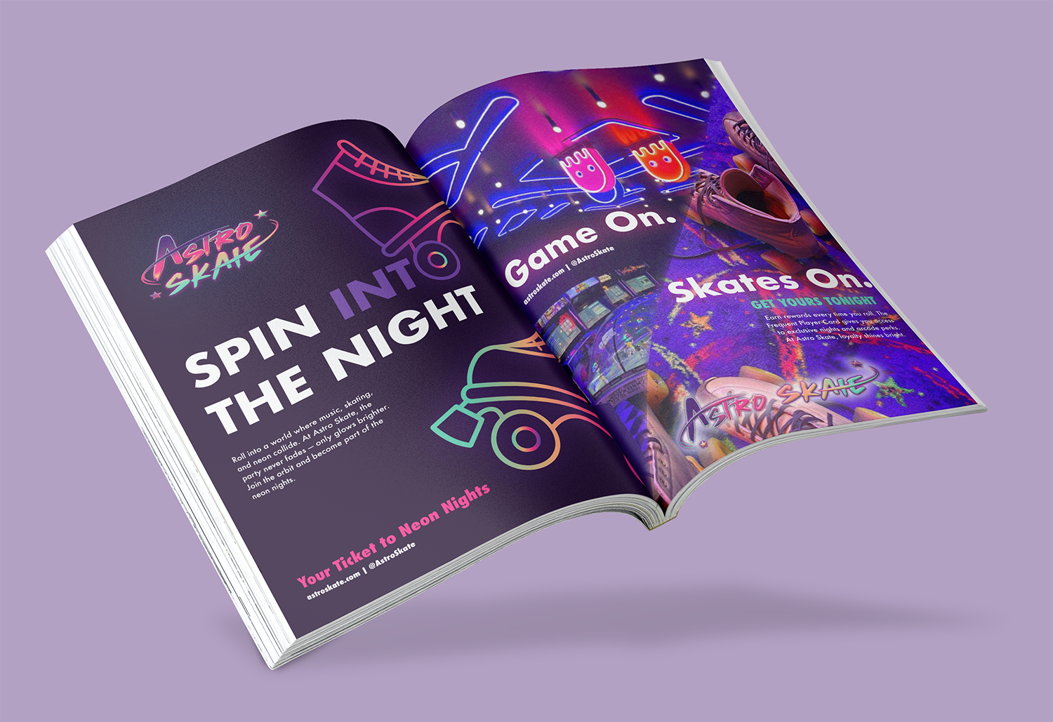 Astro Skate is designed for socially active adults between the ages of 18 and 35 who are drawn to nostalgic aesthetics and shared experiences. They seek visually engaging environments that feel both authentic and immersive, where they can connect with others and fully experience the atmosphere. The brand aims to create a space that feels lively, memorable, and visually distinct.