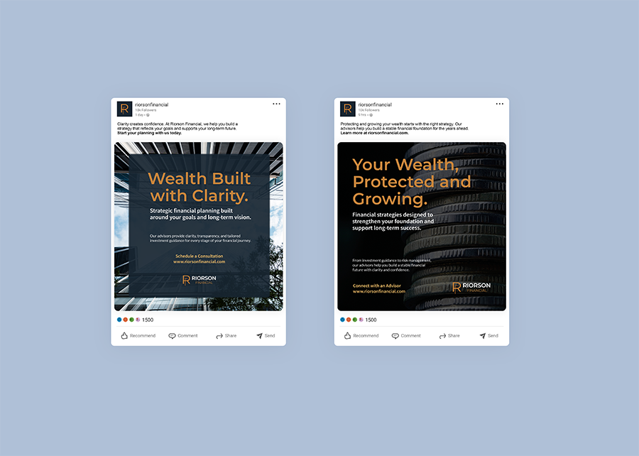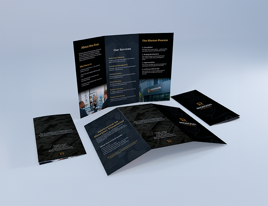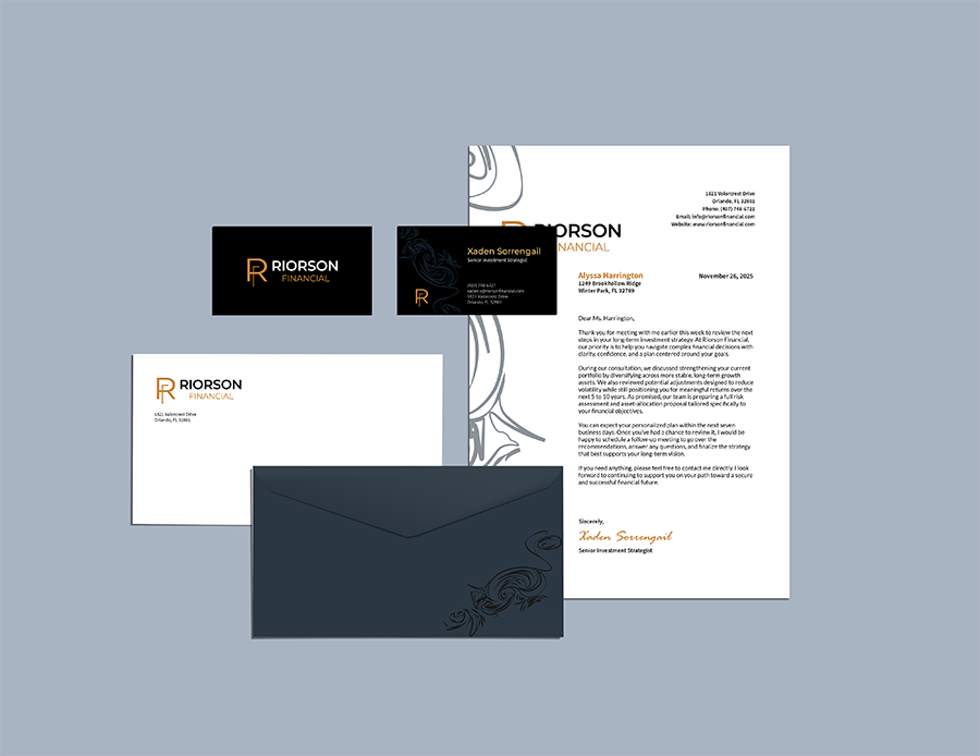 Riorson Financial is designed for individuals and businesses seeking reliable financial guidance. The audience values clarity, organization, and trust, and is drawn to brands that feel both established and forward-thinking. The identity aims to create a sense of confidence and reassurance through clean design and thoughtful execution.